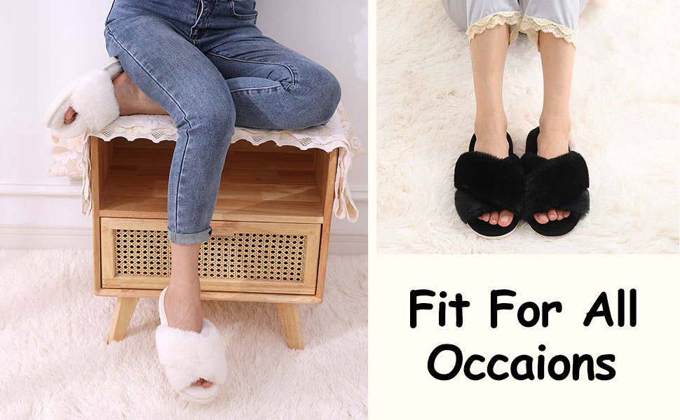 • Fashionable Open-Toe Design: Fur design for style and practicality. Easy to slide into for instant Comfort.